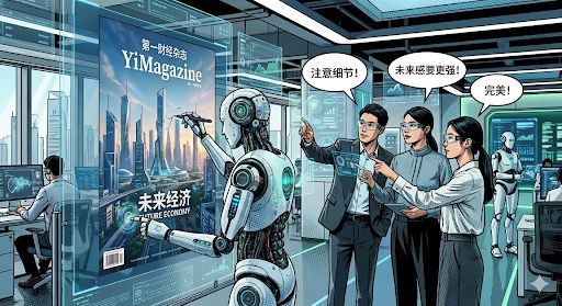 记者第一次是让Nano Banana 的第一代和现在的Pro分别生成一张未来的新闻编辑部的照片,一个未来的AI机器人绘制杂志的封面 ,旁边几位专业人士在指导绘画细节,强调未来感、高清、细节。