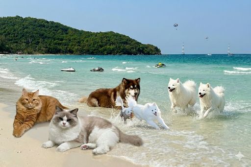 在官方博客中,谷歌表示可以用多张图像融合,并保持角色的一致性。记者第二次按照这一方向 ,输入了5张照片 ,包括4张宠物照片和一张景色,简单提示模型将它们融合在一起 。