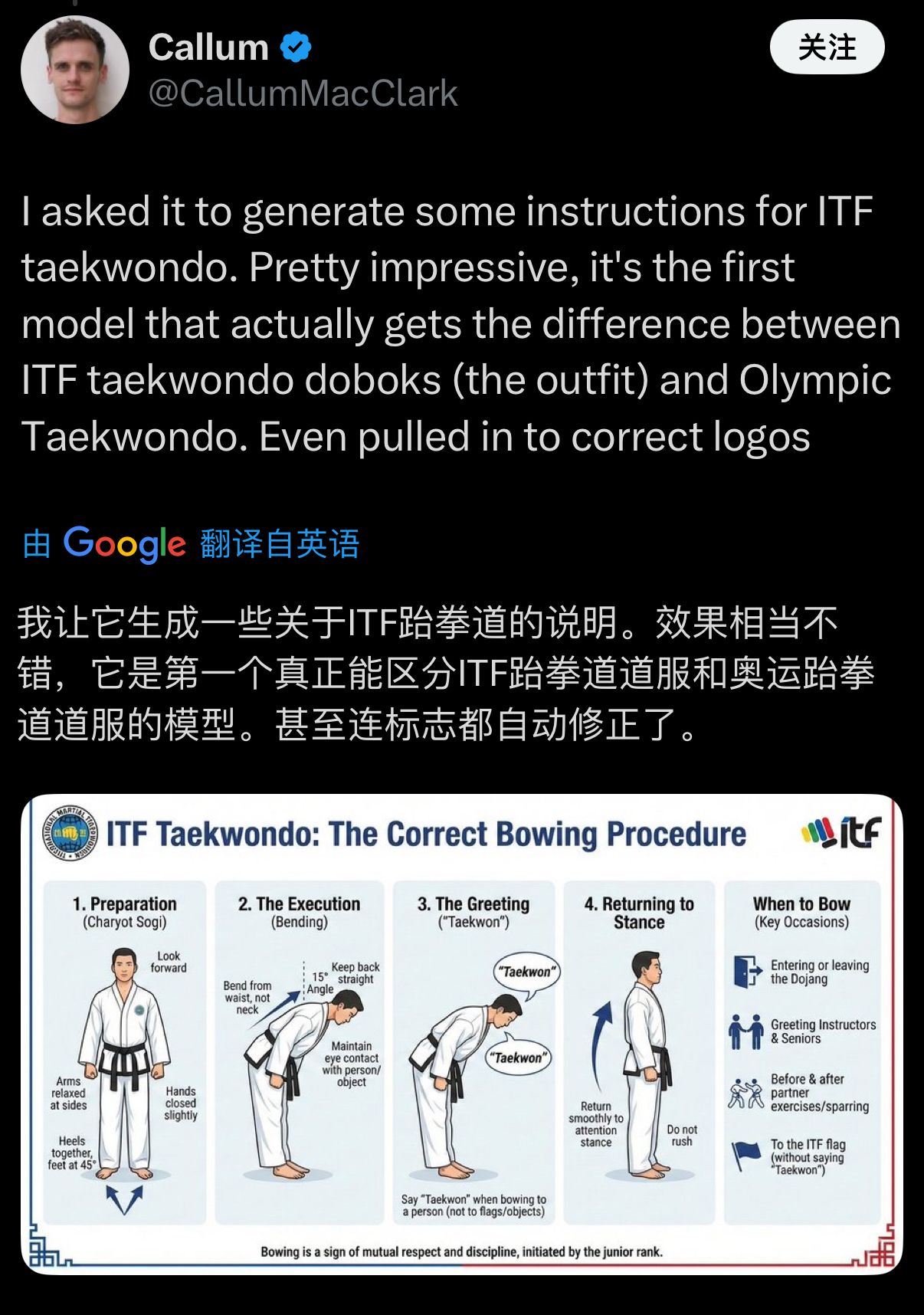 还有网友让模型生成一些关于ITF跆拳道的说明 。他表示,效果相当不错 ,“它是第一个真正能区分ITF跆拳道道服和奥运跆拳道道服的模型。甚至连标志都自动修正了。 ”