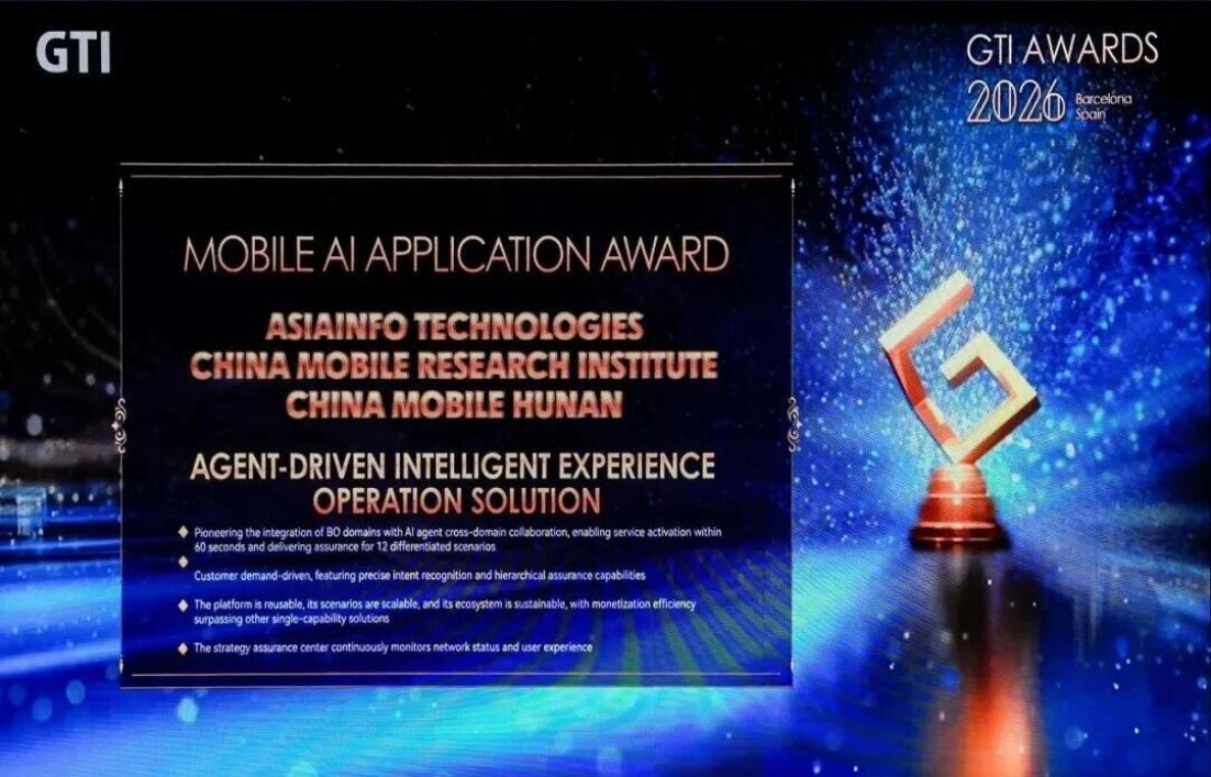 3月3日 ,MWC26·Barcelona(2026世界移动通信大会·巴塞罗那)期间,全球通信行业重磅奖项GTI Awards正式揭晓 。亚信科技携手中国移动研究院、湖南移动打造的“智能体驱动的体验保障管理解决方案”凭借领先的技术创新与落地实践斩获“最佳移动AI应用奖”(Mobile AI Application Award)。这标志着亚信科技与中国移动在AI技术创新和服务变现等方面的探索获得了全球通信行业的高度认可。