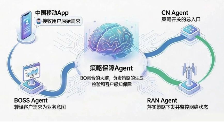 一是首创跨B域与O域的多智能体协同机制 ,通过多智能体的高效联动,完成用户语音/文本意图到SLA保障策略的秒级识别、转译与执行,实现用户意图向网络保障动作的自动化转化;